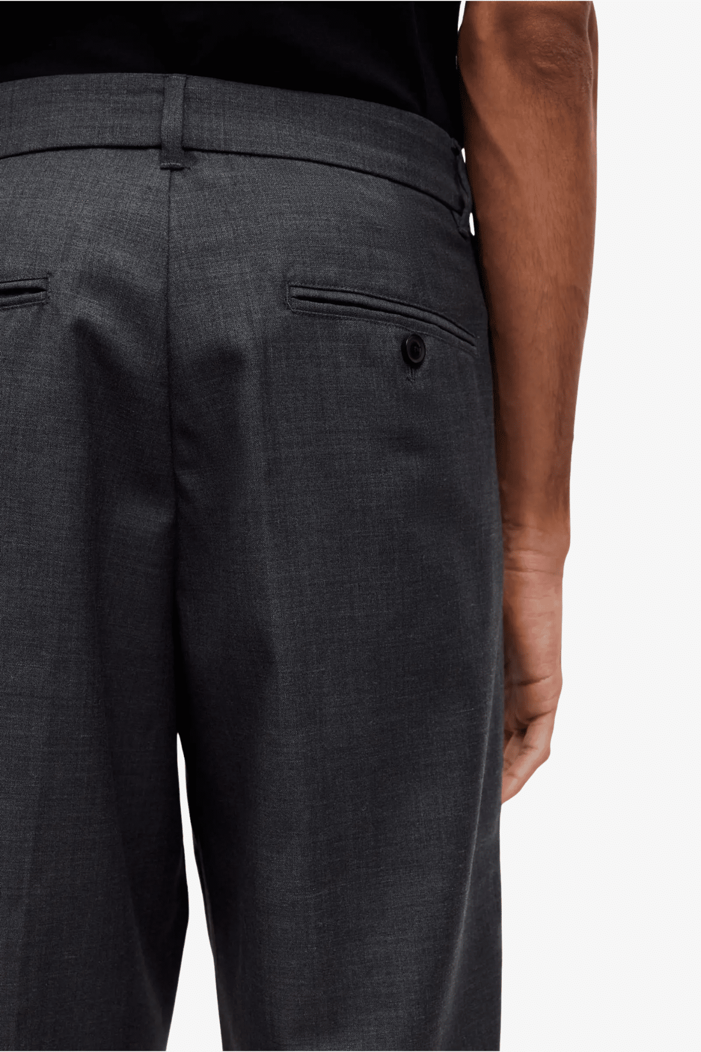 Riemlussen geven de mogelijkheid om een riem te dragen voor extra stijl of functionaliteit. De geperste plooien aan de voor- en achterkant geven de broek een nette afwerking. Het hoofdmateriaal bestaat uit 50% gerecycled polyester en 50% wol, wat een duurzame en warme keuze biedt.