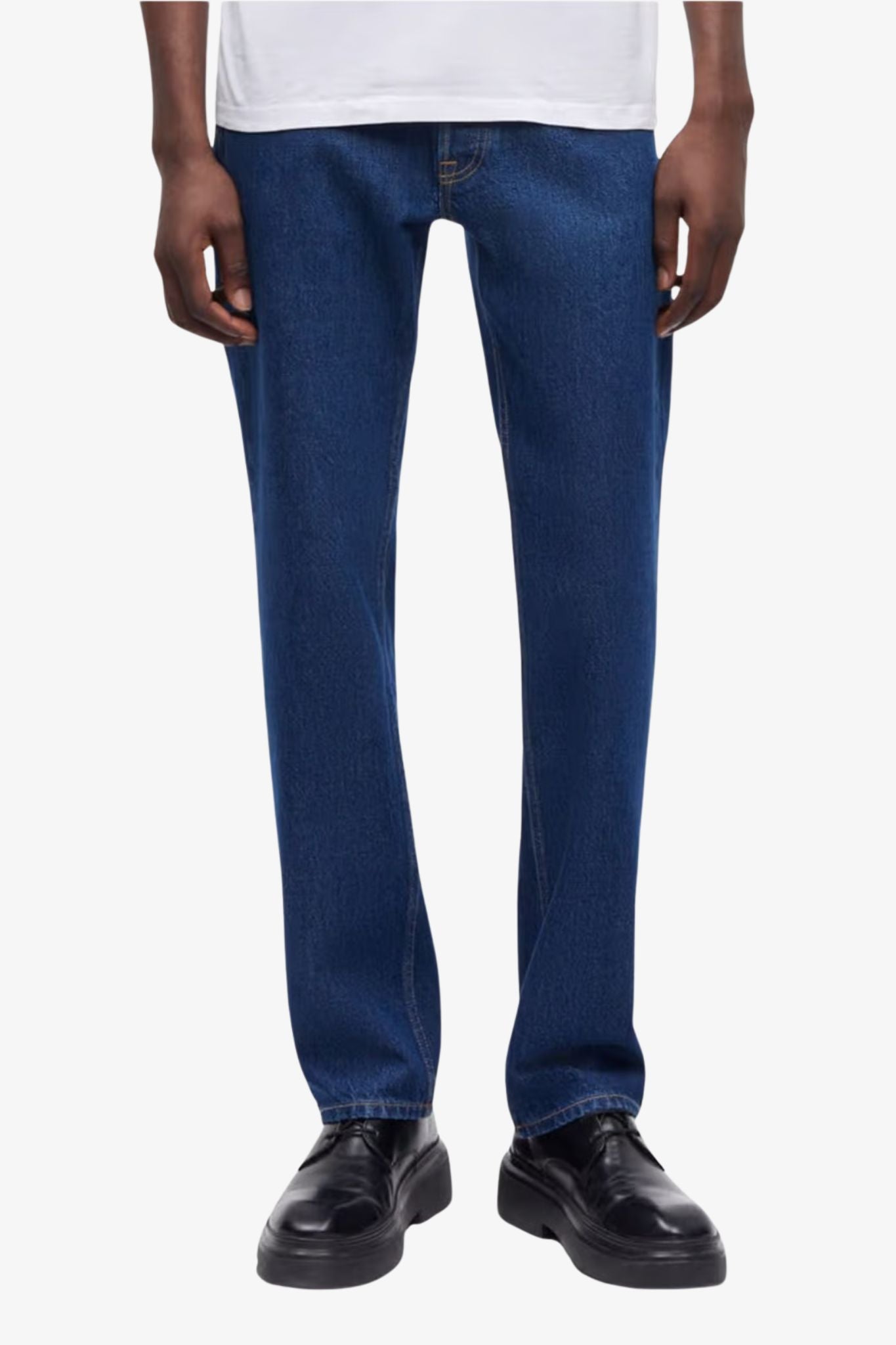 Jeans met een normale pasvorm en rechte pijpen. Normale taille. Knoopsluiting bij de gulp. Five-pocketmodel. Riemlussen. Hoofdmateriaal: 100% biologisch katoen.