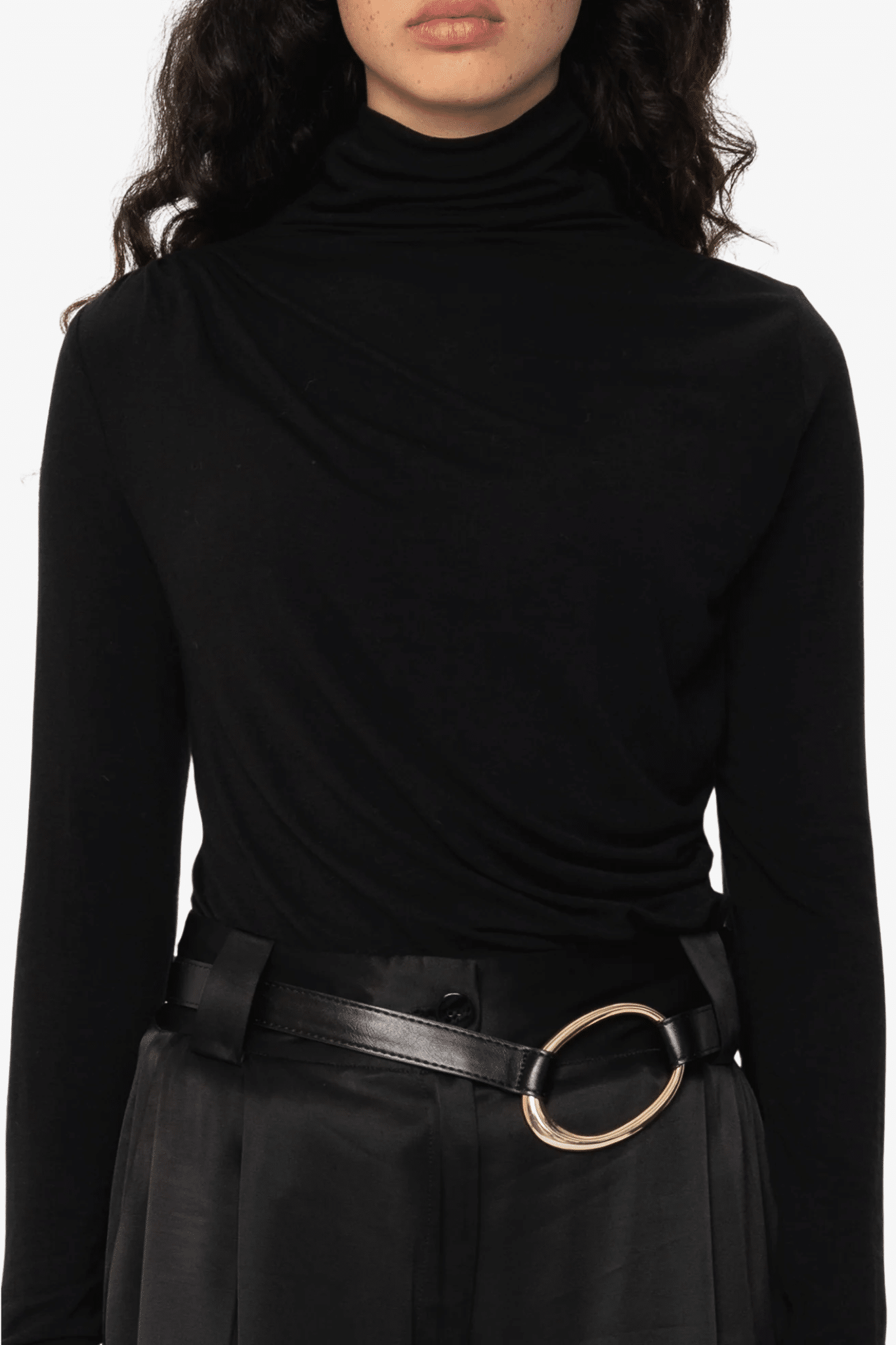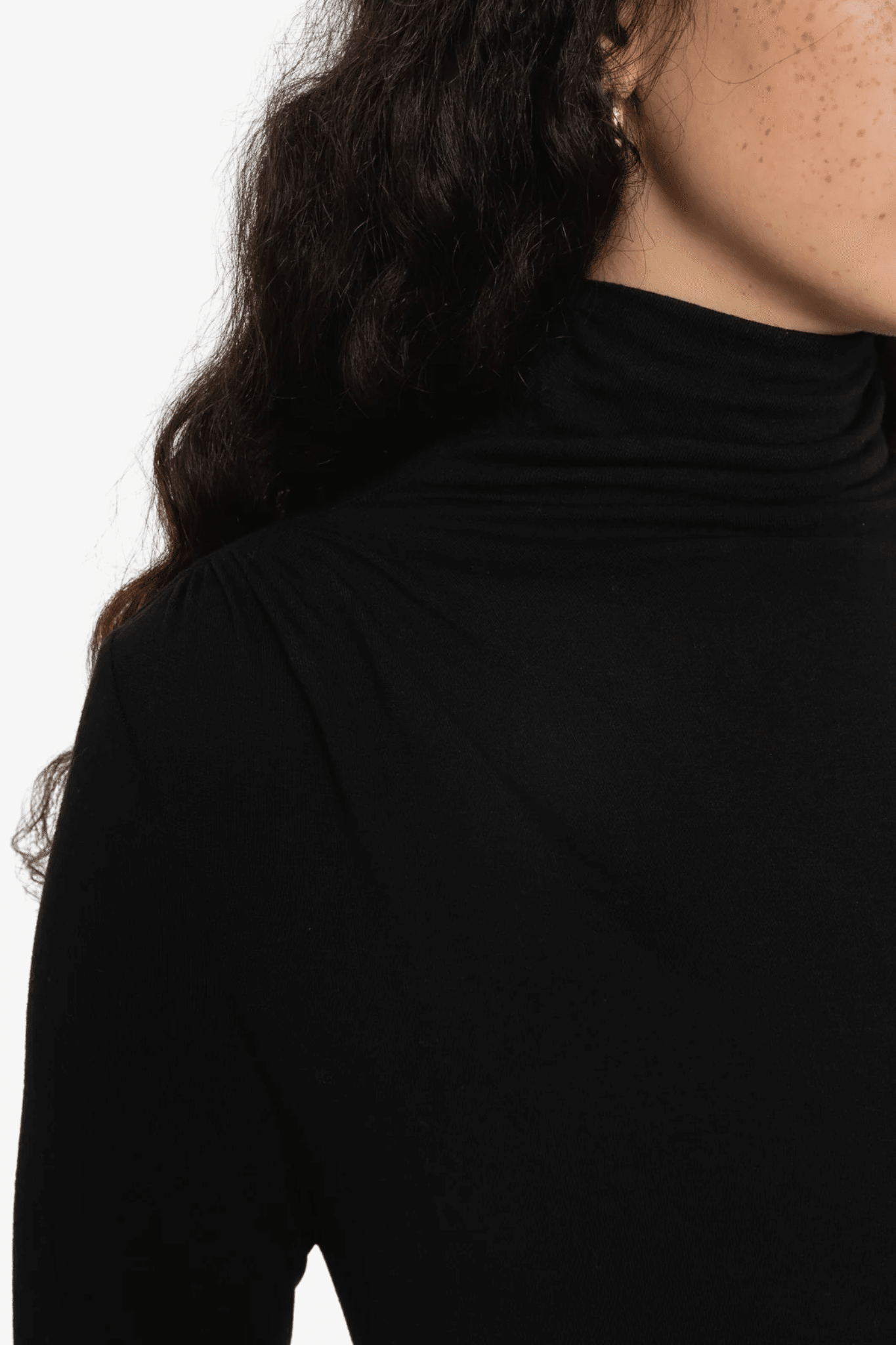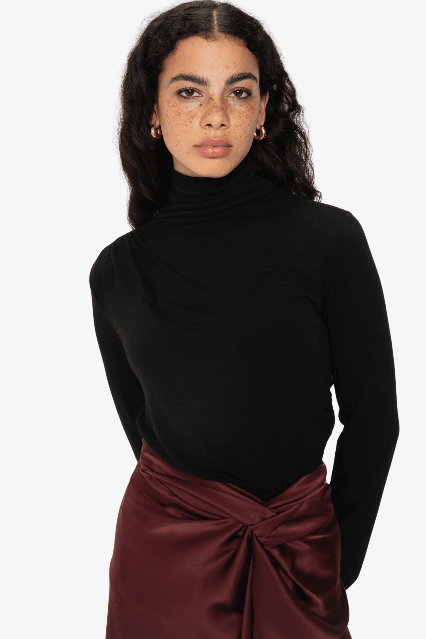 Met de vernieuwde versie van de Fir top introduceert Viveh een moderne interpretatie van de klassieke coltrui, in een tijdloze zwarte kleur die gemakkelijk te combineren is met elke outfit.