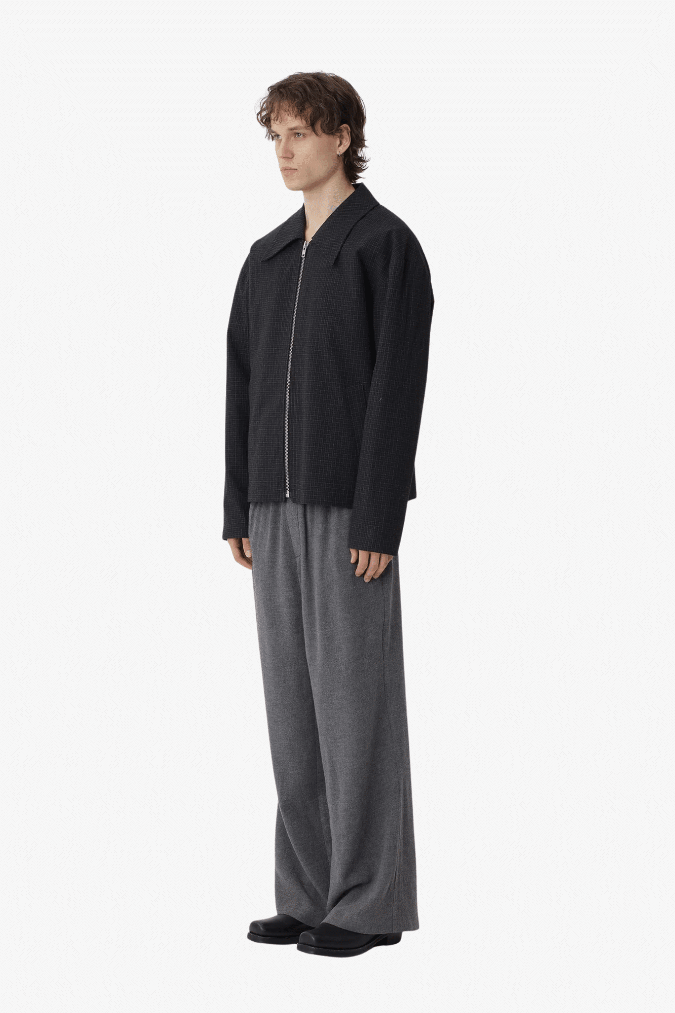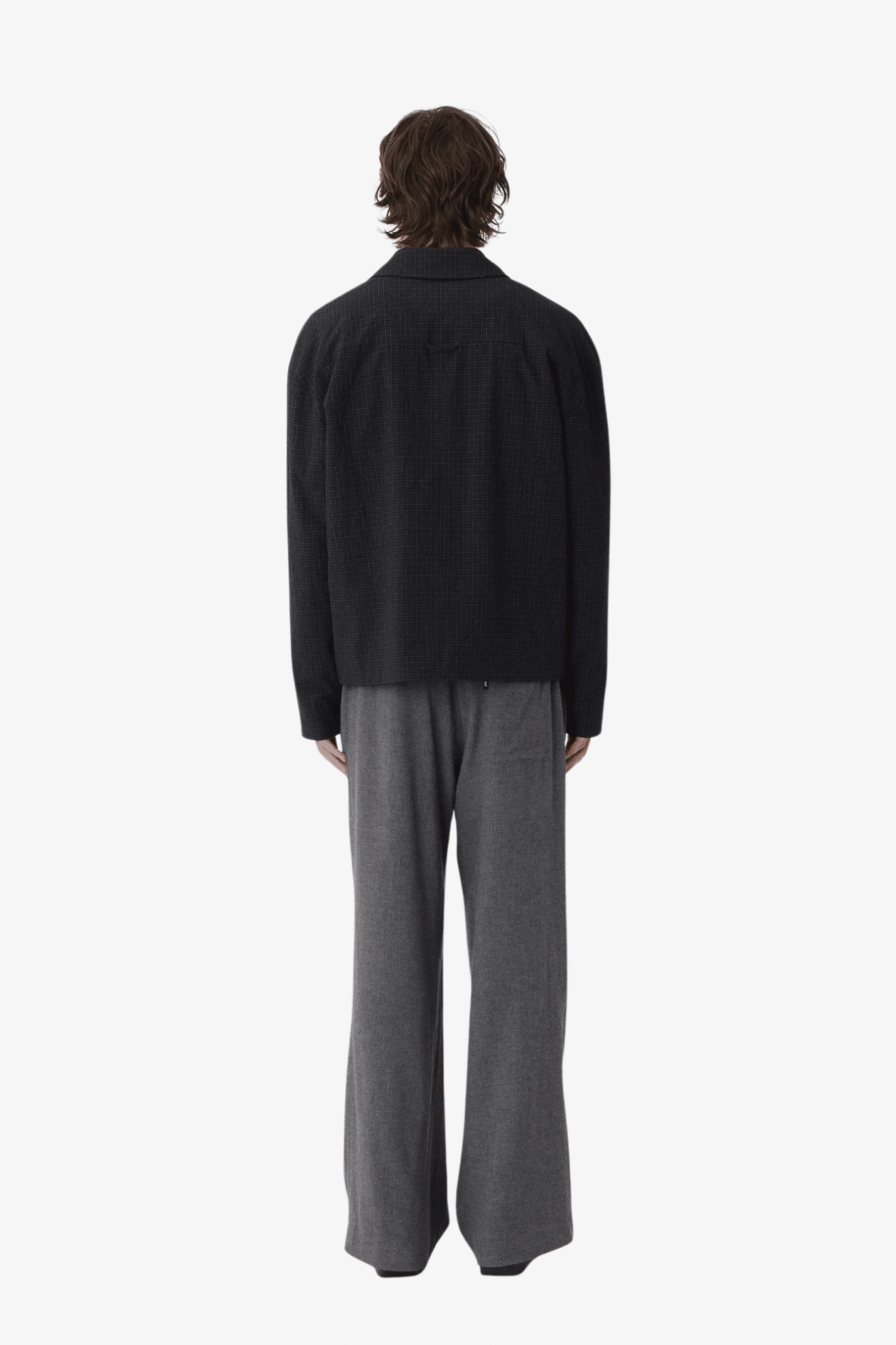 The Won Hundred Sebastian Jacket is a distinctive boxy silhouette designed for men who appreciate a modern, contemporary look. Featuring broad shoulders and a prominent oversized collar, it offers a unique style statement. Equipped with angled pockets and a zipper closure, it combines practicality with design. Crafted from a garment-washed cotton blend with a subtle check pattern, it adds texture without overwhelming the outfit. Available in black, this jacket is versatile for both casual and semi-formal occasions. For any questions, please feel free to contact our customer service.